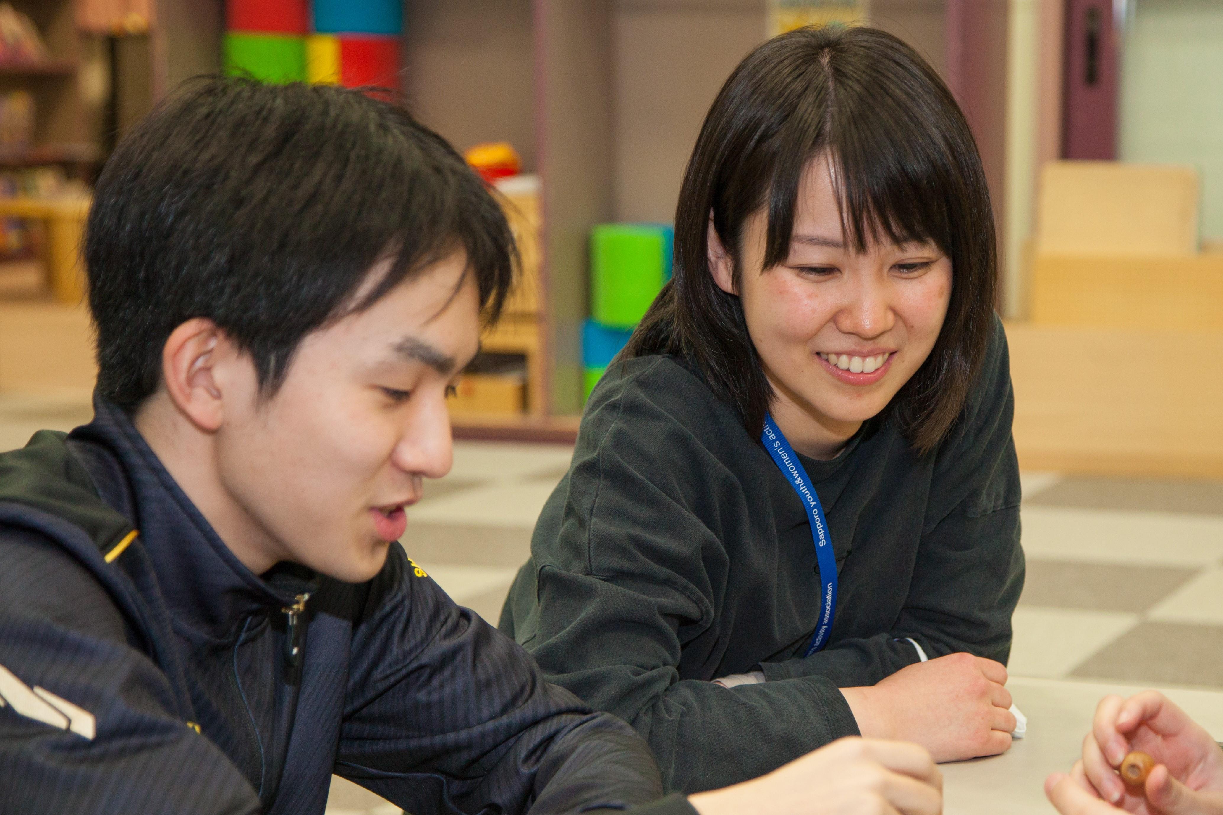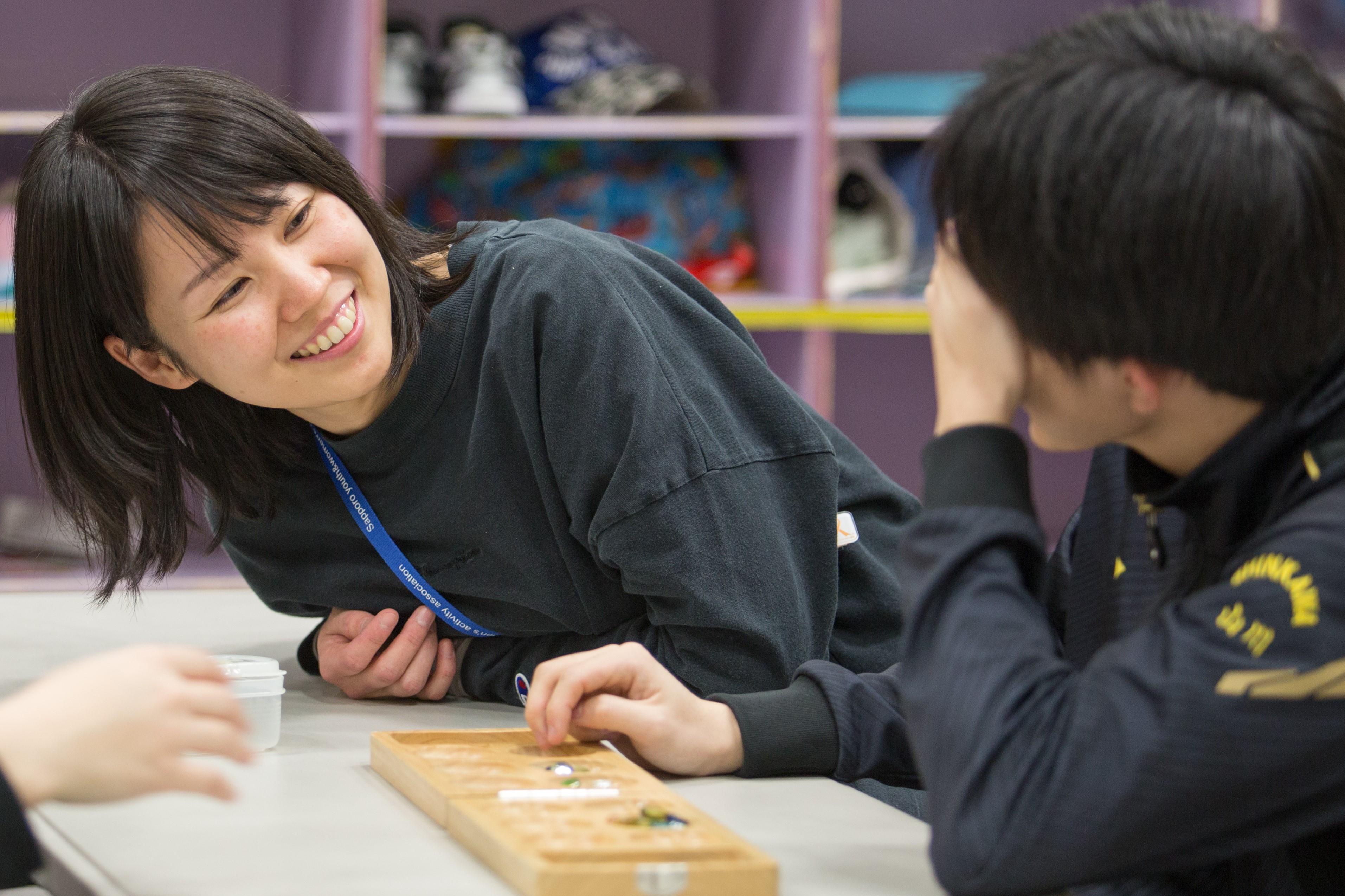 職員の仕事は、トランプなどのゲームや、昔ながらのカルタやけん玉、時には運動など「遊びを通して子どもの育ちを支えること」です。